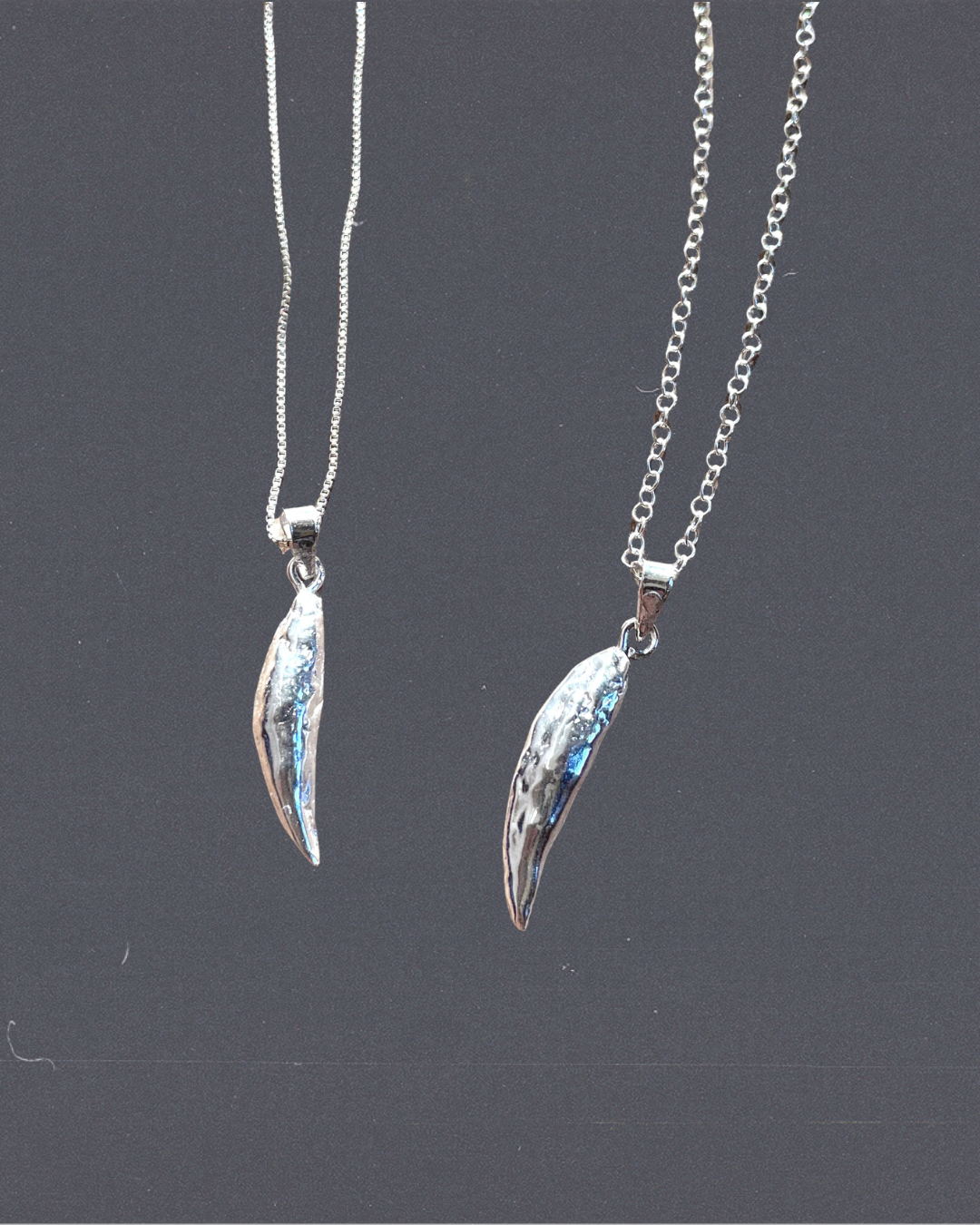 Two custom cat tooth pendants in sterling silver on 16” sterling silver chains.