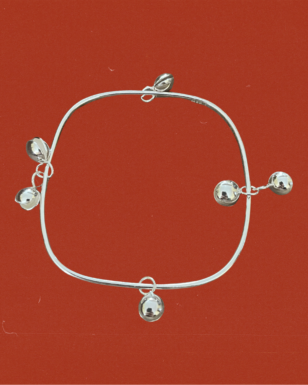 This unique square bangle made of upcycled sterling silver features handmade bells inspired by traditional Indian ghungroos, musical bell covered anklets worn by classical Indian dancers. The bangle is adorned with six bells which create beautiful jingling sounds when worn. The sound of ghungroos is believed to attract positive energy and can be used as a tool of meditation. The bangle has a diameter of 2.75 inches diagonally.